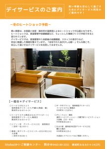 寒い季節は、お部屋と浴室・脱衣所の温度差によるヒートショックが心配になります。 ヒートショックは、室温管理や体調確認など、ちょっとした環境づくりで予防できると言われています。 デイサービスでは、室温管理や入浴前後の体調確認、スタッフの見守りなど、安全に配慮した環境を整えています。