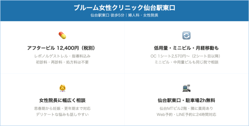 | ブルーム女性クリニック | 仙台駅東口徒歩5分 | 緊急避妊ピル(レボノルゲストレル系) | 12,400円(税別、指導料・薬剤料込み) | 初診料・再診料・処方料は不要と明記。検査実施時のみ別途費用 | 低用量ピル・ミニピル・月経移動とセットで解説。ピル専用の詳しい解説ページあり。 |