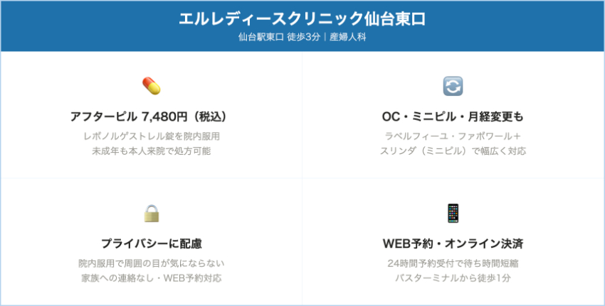 | エルレディースクリニック仙台東口 | 仙台駅東口徒歩3分 | レボノルゲストレル錠1.5mg | 7,480円(税込) | 自費処方。アフターピル料金に診察込みの扱い(詳細は要確認) | 低用量ピル・ミニピル・月経変更も同じページで案内。WEB予約&オンライン決済対応で駅近。 |