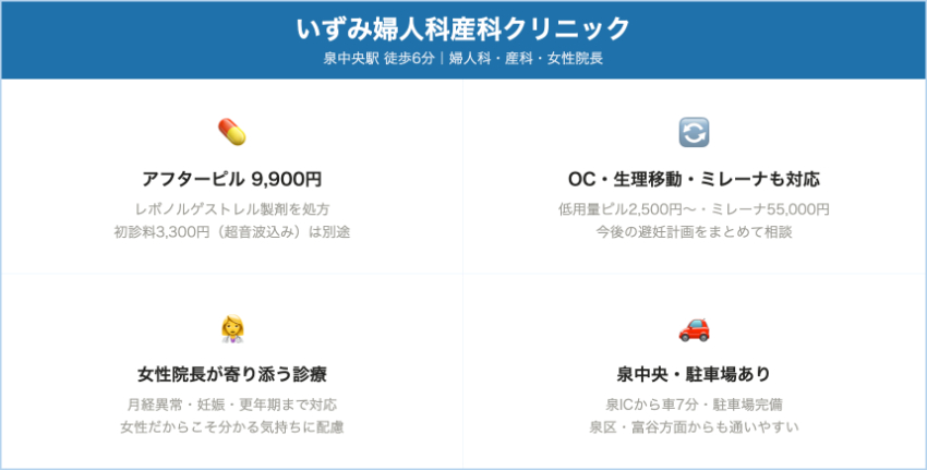 | いずみ婦人科産科クリニック | 泉中央駅東側出口徒歩6分 | レボノルゲストレル | 9,900円(税込) | 初診料3,300円(超音波込み)が別途必要 | 泉中央エリア。低用量ピル・生理移動・ミレーナも同一ページで料金公開。駐車場あり。 |