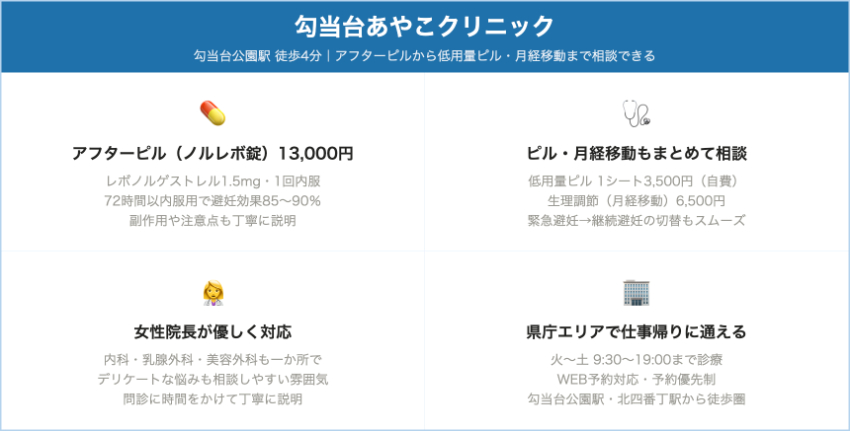 | 勾当台あやこクリニック | 勾当台公園駅徒歩4分 | ノルレボ錠(レボノルゲストレル1.5mg) | 13,000円 | 料金は薬剤費として13,000円。低用量ピルは1シート3,500円+年1回血液検査料1,000円 | 内科・女性内科・乳腺外科と併設で、からだ全体とピルを相談しやすい体制。 |