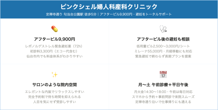 | ピンクシェル婦人科産科クリニック | 勾当台公園駅徒歩約5分(定禅寺通り) | レボノルゲストレル(緊急避妊薬) | 9,900円(税込) | 初診料3,300円(税込・エコー代含む)が別途必要 | 低用量ピル・月経移動・ミレーナまで自費で網羅。サロン風の院内で完全予約制。 |