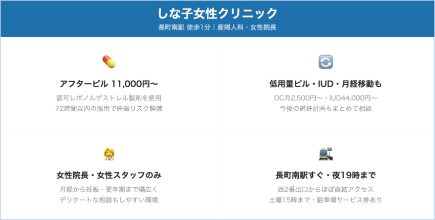 | しな子女性クリニック | 長町南駅徒歩1分 | レボノルゲストレル(モーニングアフターピル) | 11,000〜13,620円(税込) | 診察料込みかどうかはサイト上明記なし(要確認) | 低用量ピル・緊急避妊・子宮内避妊具などを「避妊」ページでまとめて案内。女性院長。 |