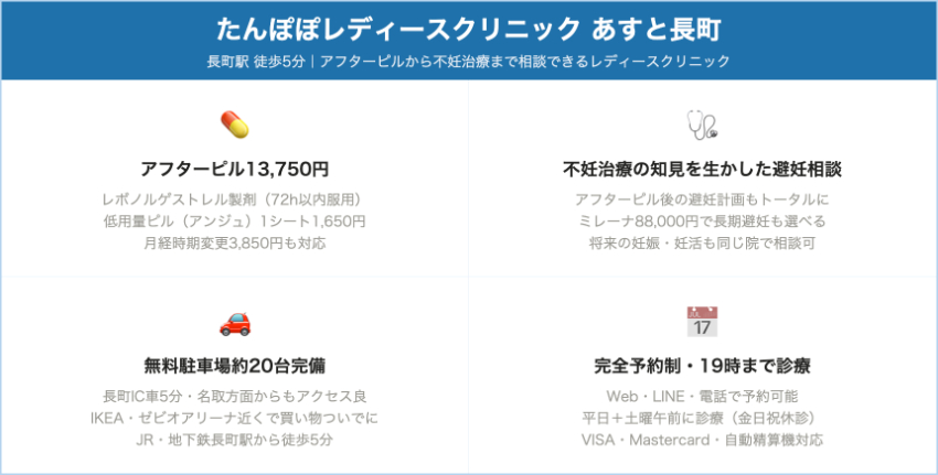 72時間以内の緊急避妊ピルを明瞭な料金体系で提供しているだけでなく、低用量ピルやミニピル、中用量ピルによる月経移動なども同じ院内で完結するため、今回のアフターピルをきっかけに、生理痛やPMS、将来の妊娠計画まで含めてトータルに相談したい人にとって心強い選択肢になります。