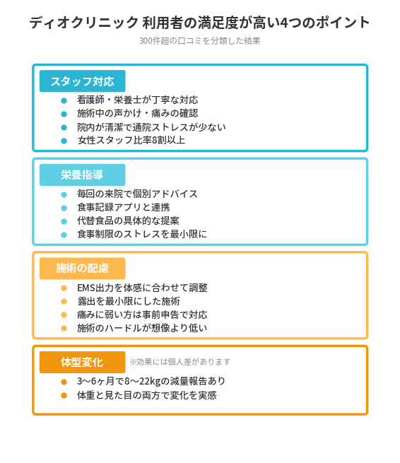 300件超の口コミを筆者が分類したところ、ディオクリニックの高評価は大きく4つのテーマに集中していました。