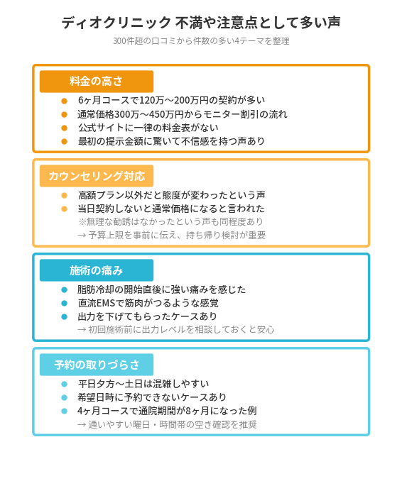 高評価が目立つ反面、ディオクリニックの口コミには料金面やカウンセリング対応への不満も一定数投稿されています。 ここでは、筆者が特に件数の多かった4つの不満テーマを整理しました。