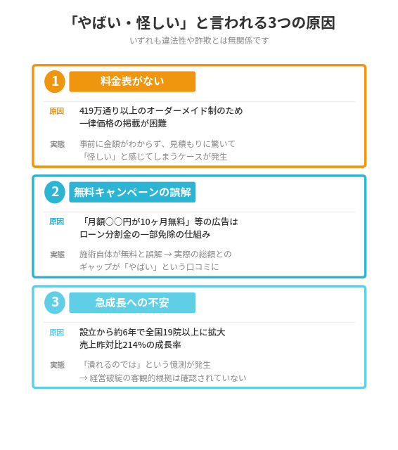 ネット上で見かけるやばい・怪しいという評判の大半は、オーダーメイド制の料金体系が分かりにくいことと、広告表現への誤解から生まれています。 ここでは、ネガティブな評判が広がった具体的な原因を3つの観点から検証します。