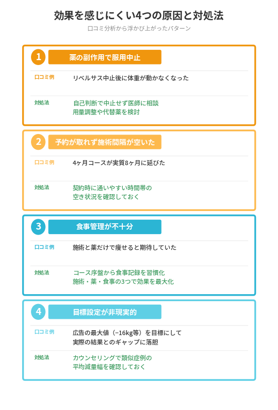 とはいえ、効果には個人差があり、全員が同じ結果を得られるわけではありません。 体質や薬への反応、食事管理の徹底度によって結果が変わるため、カウンセリングで自分の目標と照らし合わせて期待値を確認しておくとよいでしょう。
