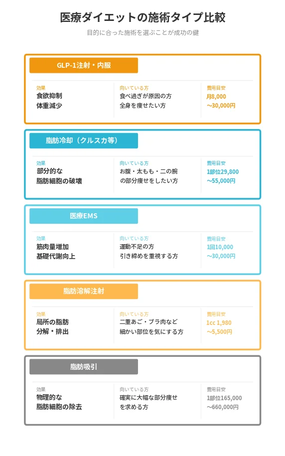 - GLP-1・マンジャロ・クールスカルプティングなど施術種別ごとの特徴と自分に合った選び方