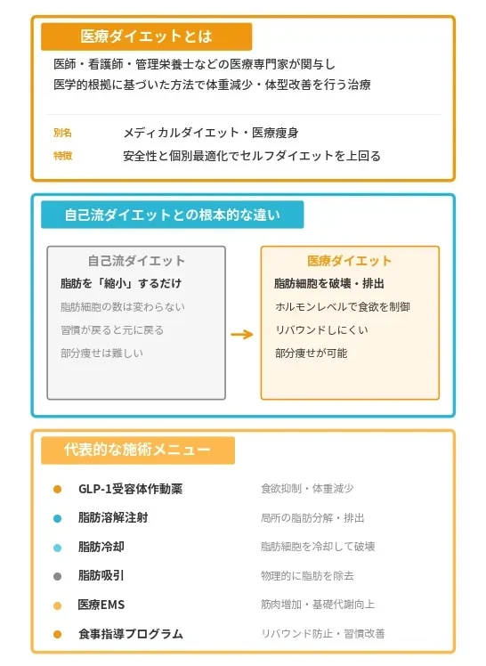 医療ダイエットは医師が診察・処方・施術を行う医療行為であり、痩身エステはあくまで美容サービスです。最も大きな違いは「使用できる手段の範囲」にあります。医療ダイエットでは、GLP-1などのダイエット薬の処方、脂肪溶解注射、医療機器による脂肪冷却など、エステでは使用できない医薬品・高出力機器を用いることができます。その分、効果の確実性が高く、副作用が生じた際も医師がすぐに対応できる体制が整っています。費用はエステより高くなる場合が多いですが、脂肪細胞そのものを減らすアプローチが可能なため、リバウンドのリスクを抑えやすい点が大きな利点です。