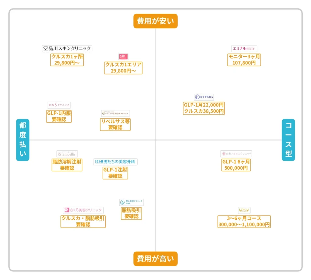 全身の体重を落としたい方にはGLP-1対応院(ディオクリニック・広島プルミエ・湘南美容クリニックなど)、部分痩せ重視なら脂肪冷却や脂肪溶解注射が充実する院が向いています。
