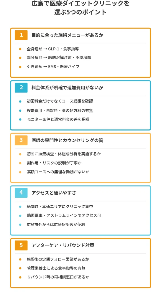 広島市内には12院以上の医療ダイエット対応クリニックがあります。目的と予算に合ったクリニックをまず3〜5院に絞り込みましょう。
