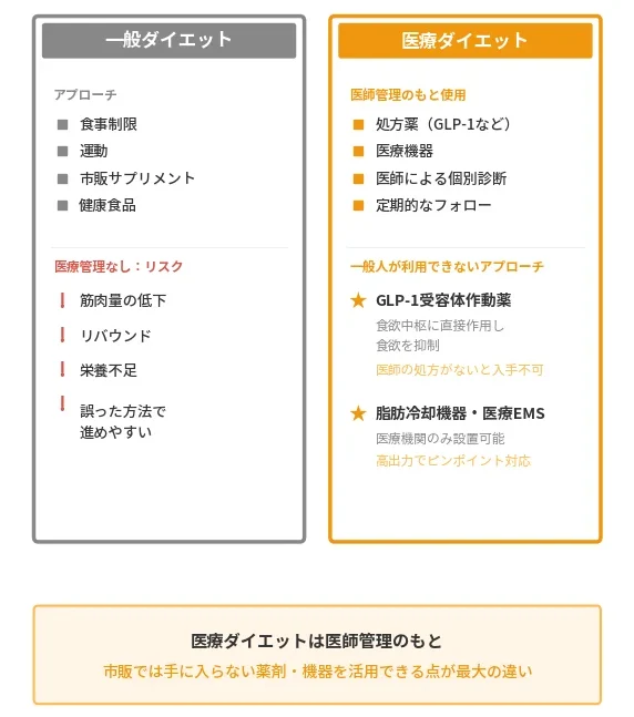 最大の特徴は、薬に頼るだけでなく脂肪細胞そのものを減らす医療機器施術と、リバウンド防止のための体質改善を組み合わせた総合プログラムにあります。
