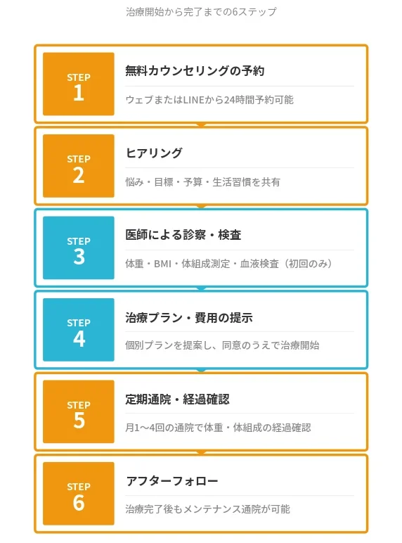治療中は定期的な通院(月1〜4回)で体重・体組成の経過確認と医師のフォローアップを受け、治療完了後も希望に応じてメンテナンス通院やアフターフォローを受けられるクリニックが多くあります。
