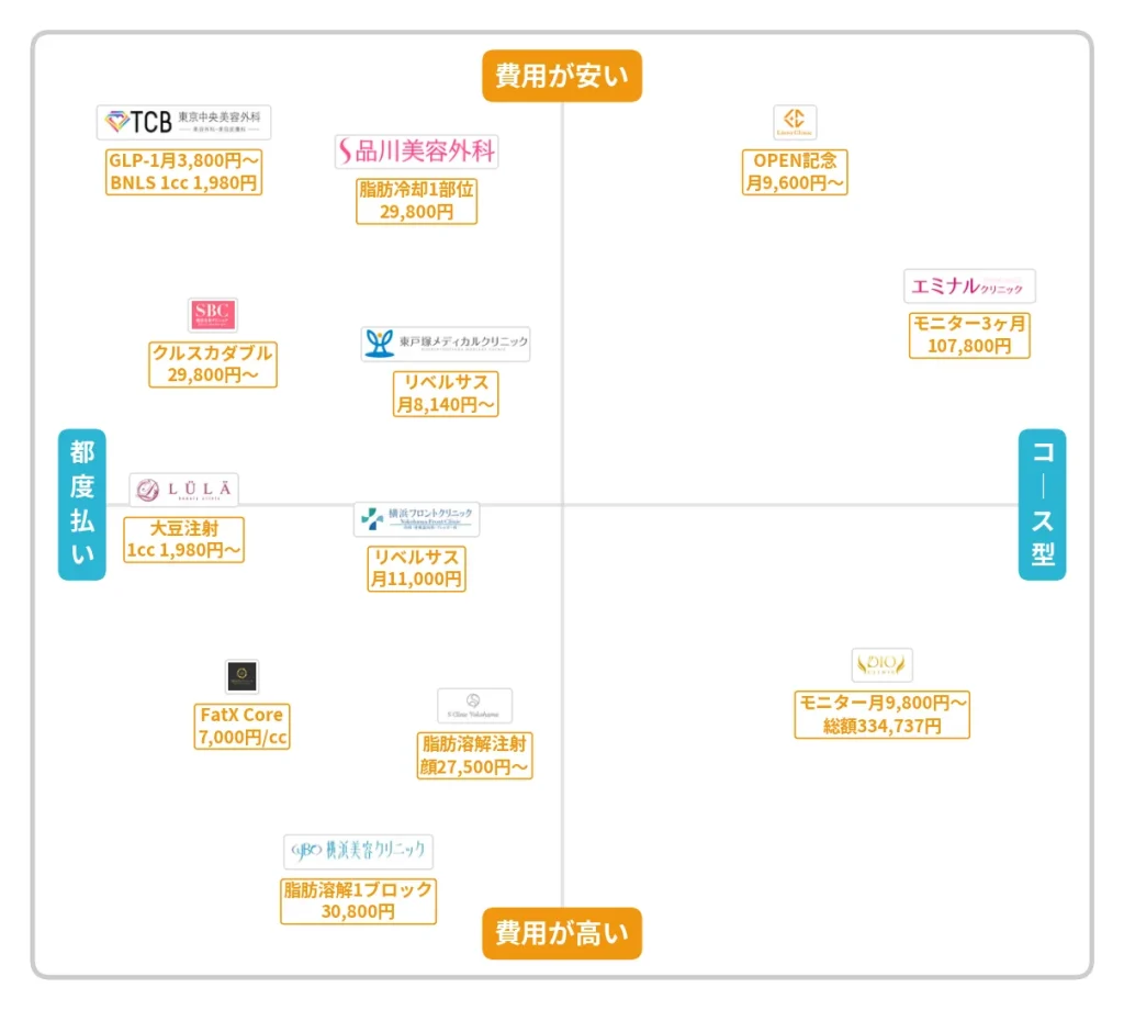 費用の安さを優先するならTCBのGLP-1(月々3,800円〜)やルラ美容クリニックの大豆注射(1cc 1,980円〜)が、確実な減量効果と医学的サポートを重視するなら東戸塚メディカルクリニック・横浜フロントクリニックが適しています。