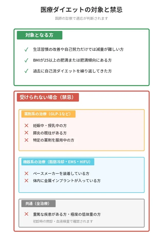 産後・授乳中の方は医療ダイエットの多くの治療が受けられません。GLP-1受容体作動薬(リベルサス・マンジャロ・オゼンピックなど)は妊娠中・授乳中の使用が禁忌とされており、胎児や乳児への影響が懸念されます。脂肪溶解注射・脂肪冷却・医療EMSなどの機器系施術も、産後の身体への影響・ホルモンバランスの変化・授乳中の安全性が確立されていないため、一般的には授乳が終了し、産後の身体が落ち着いた時期(産後6ヶ月〜1年以上が目安)から医師に相談することをおすすめします。産後ダイエットを考えている方は、まずかかりつけの産婦人科医・内科医に相談し、医療ダイエットを受けられる時期・方法について確認するとよいでしょう。