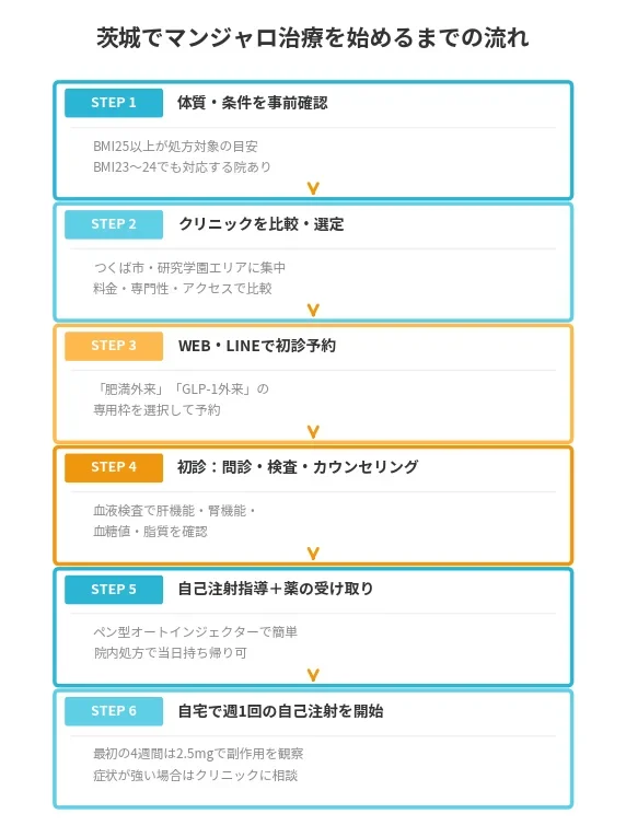 茨城県でマンジャロによる肥満外来を受診する際は、クリニック選びから初回処方、継続治療まで一定の流れがあります。