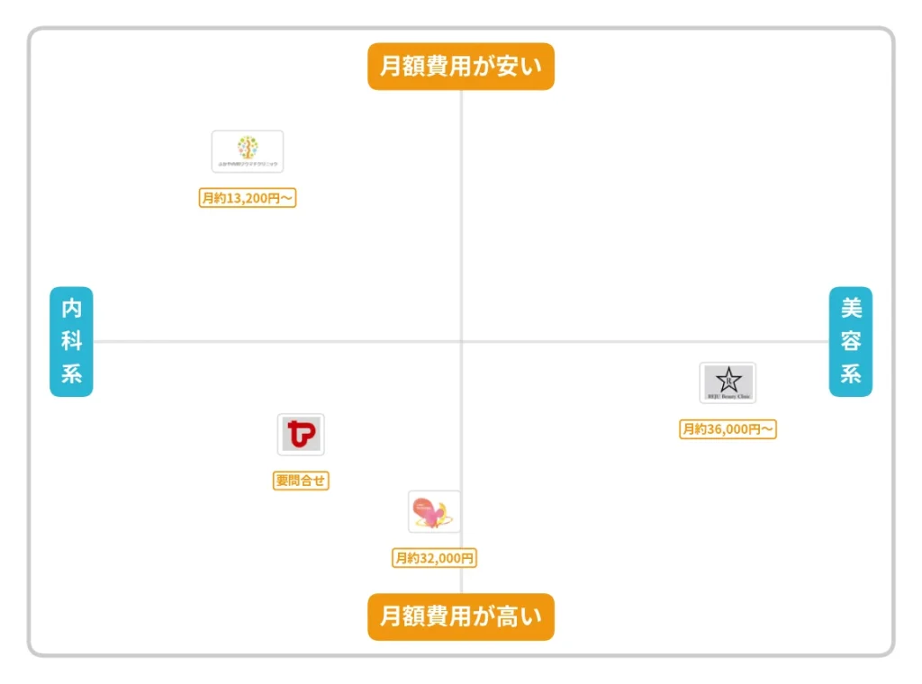 - 費用・対応用量・オンライン診療の有無など4院を一覧で比較した比較表