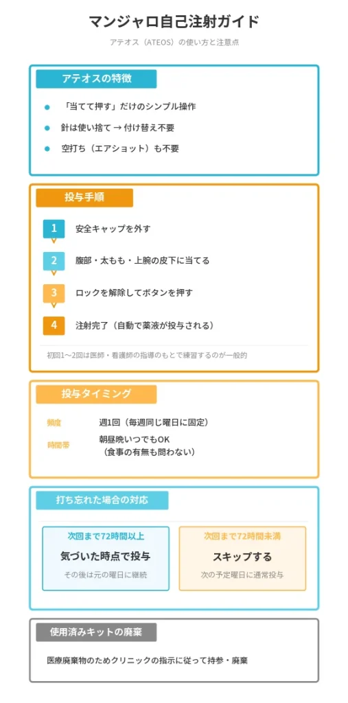 マンジャロはオートインジェクター(アテオス)を使用するため、腹部・上腕・大腿部に押し当ててボタンを押すだけで注射が完了します。