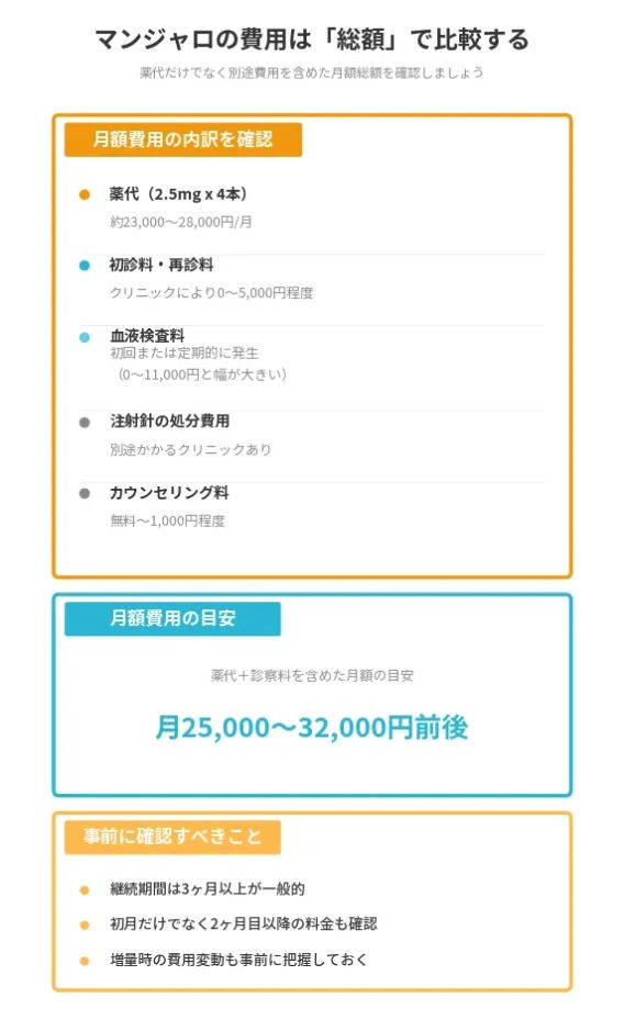 鹿児島市内の対面クリニックでマンジャロ(2.5mg×4本・1か月分)を処方してもらう場合、薬代の目安は2万3,100円〜2万8,600円(税込)程度です。これに初診料・再診料が加わる場合が多く、初月の総額は2万5,000円〜3万2,000円前後になることが多いです。福元クリニックは1本6,000円(4本で2万4,000円)、橋野循環器科・内科は初診時に1か月分2万8,600円(税込)・2回目以降2万5,300円(税込)、鹿児島ラミュー美容形成外科クリニックは初回2週間お試し11,000円・2回目以降2万3,100円(4本分)が公式サイトで確認されている料金です。用量を増やすにつれて費用も上がるため、5mgへ増量した場合は月額3万〜4万円台になるクリニックもあります。3か月以上の継続が必要になるケースが多いため、月額総額を複数のクリニックで比較してから選ぶことをおすすめします。