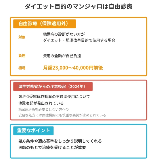 なお、厚生労働省は2024年にGLP-1受容体作動薬の不適切使用に関する注意喚起を発出しており、糖尿病の治療を必要としない方への安易な処方には医療機関側にも慎重な姿勢が求められています。