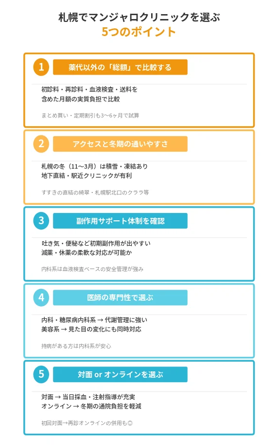 まず札幌市内でマンジャロを取り扱うクリニックを比較します。本記事で紹介した11院はエリアや特徴がそれぞれ異なります。以下の3軸で自分に合ったクリニックを絞り込むとよいでしょう。