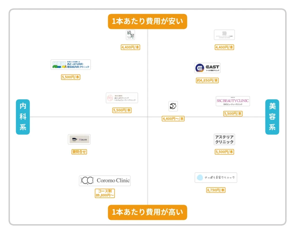 1本単位で気軽に試したい場合はクララビューティクリニックや綺翠クリニック(最安2.5mg 1本4,400円)が候補になります。