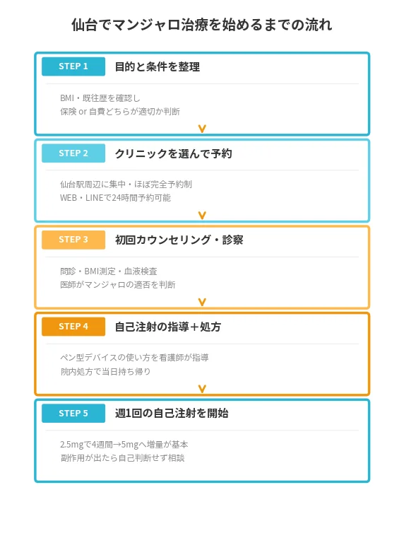 - 予約から処方・自己注射指導・継続通院まで、仙台でマンジャロ治療を始めるための6つのステップ。