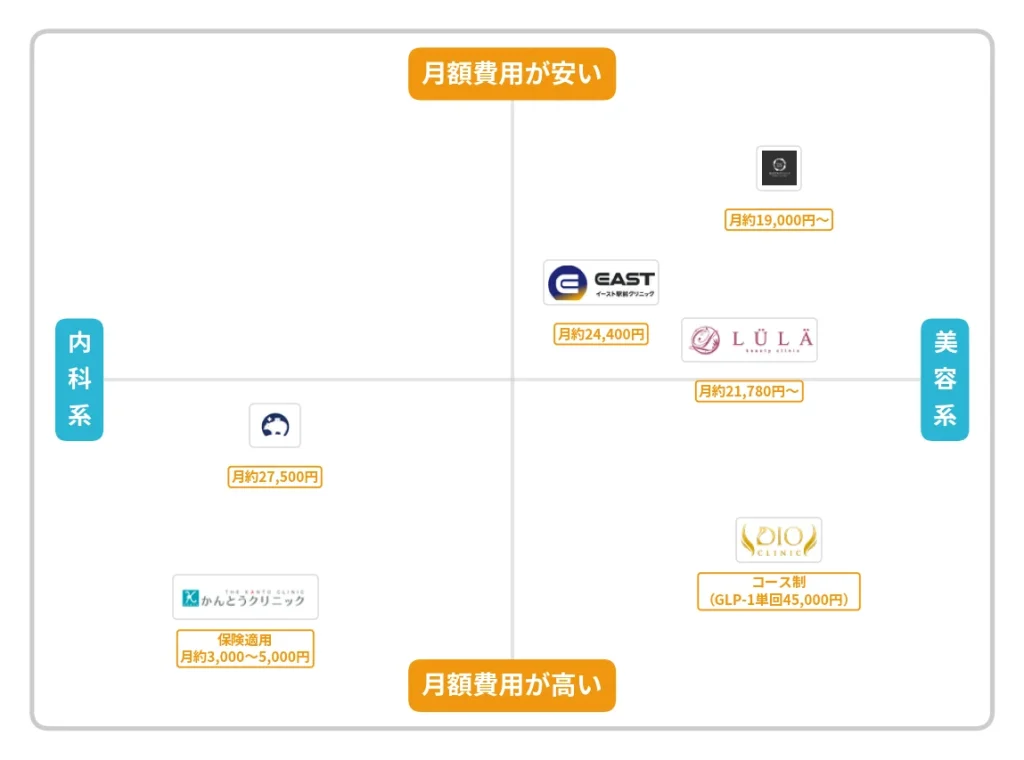 | 対象性別・年齢 | 男性のみ(肥満外来)/女性はオンライン窓口 | 男女 | 18歳以上・男女 | 男女 | 男女(マンジャロは19〜69歳) | 男女・2型糖尿病患者のみ |