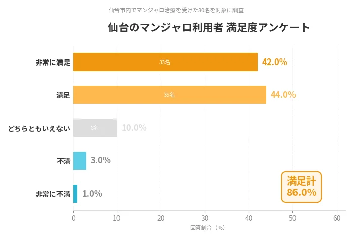- 仙台市内のマンジャロ経験者80名を対象としたアンケート調査から見えた、クリニックへの満足度と評価の傾向。