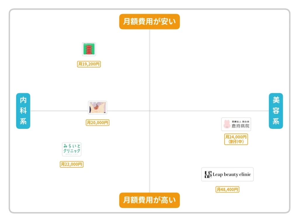| 主な診療科目 | 内科・腎臓内科・循環器内科・泌尿器科 | 内科・外科・呼吸器内科・胃腸内科 | 美容外科・美容皮膚科 | 内科・糖尿病内科・内分泌内科・漢方内科 | 整形外科・皮膚科・美容皮膚科 |