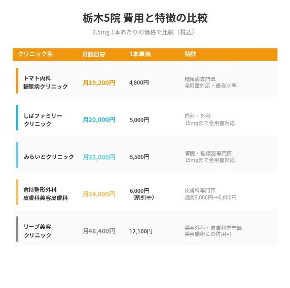 - 栃木県内5院のマンジャロ料金・対応用量・診療時間・アクセスの徹底比較