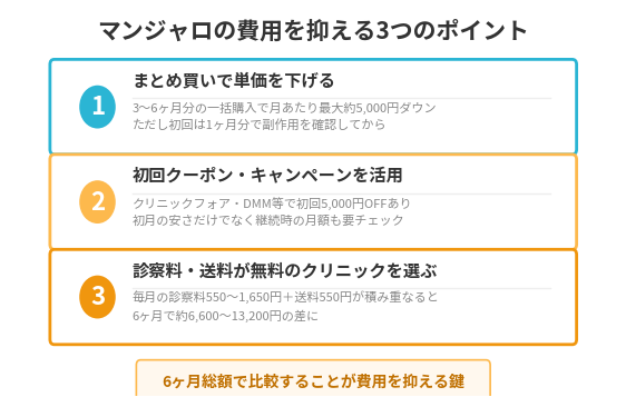 マンジャロの費用を抑える方法は、まとめ買い・初回クーポンの活用・診察料と送料が無料のクリニックの選択の3つです。著者が14院の料金体系を比較した結果、同じ2.5mgでも購入方法やクリニック選びによって6ヶ月間の総額で最大約12万円の差が生じることがわかりました。