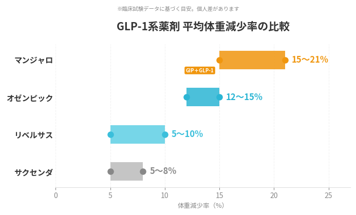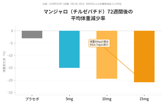 マンジャロの体重減少効果は、投与開始から4〜12週間で自覚し始めるケースが多いとされています。臨床試験SURMOUNT-1では、5mgの維持用量で72週間(約17ヶ月)投与した場合に平均15.0%の体重減少が報告されています(The New England Journal of Medicine, 2022年)。効果の出方には個人差がありますが、最低でも3ヶ月程度の継続が推奨されます。1〜2ヶ月で効果が感じられなくても、医師と相談しながら用量調整を行いつつ継続することで体重変化が現れる場合があります。