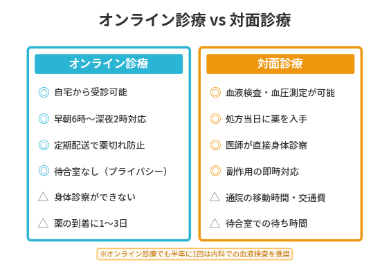 オンライン診療は通院不要で時間の節約になる反面、身体診察や血液検査が受けられません。対面診療は医師の直接診察や注射指導を受けられる反面、通院の手間と時間がかかります。どちらが適しているかは生活スタイルや治療への期待によって異なるため、それぞれの特徴を把握したうえで選択してください。