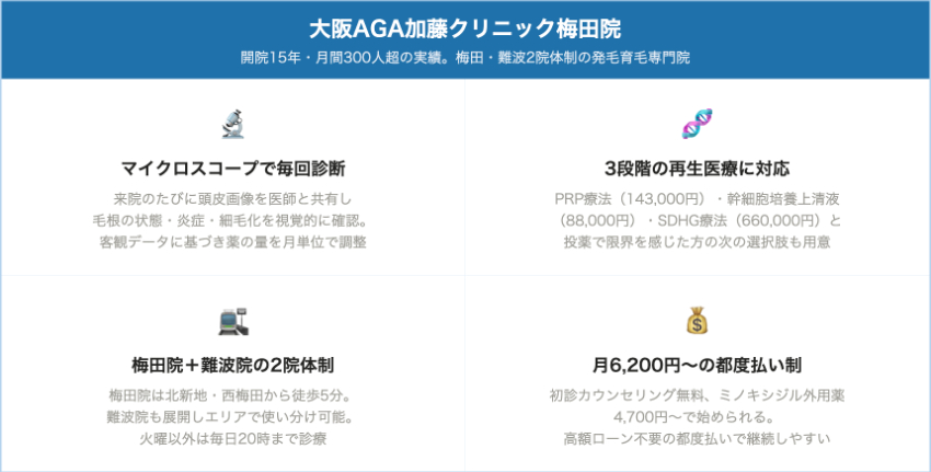 再生医療も検討したい場合は大阪AGA加藤クリニック・大阪梅田皮フ科スキンクリニックが対応しています。