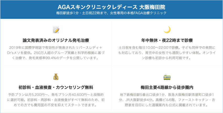 AGAスキンクリニックレディース 大阪梅田院|梅田駅徒歩1分・土日祝22時まで、女性専用の本格FAGA治療が受けられるクリニック