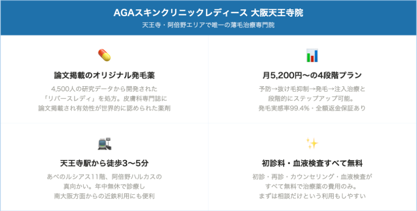 梅田エリアは複数のクリニックが集中しているため選択肢が豊富で、比較・検討してから通院先を決めやすい点が魅力です。阪急・阪神・JR・地下鉄御堂筋線の沿線在住の方や、梅田周辺に職場がある方に適しています。天王寺エリアのAGAスキンクリニックレディース大阪天王寺院は、大阪環状線・近鉄・南海・地下鉄御堂筋線が集まるターミナルであるため、南大阪・奈良・和歌山方面に住む方にとって梅田より通いやすい場合があります。居住地・職場の位置と路線を照らし合わせて選ぶとよいでしょう。