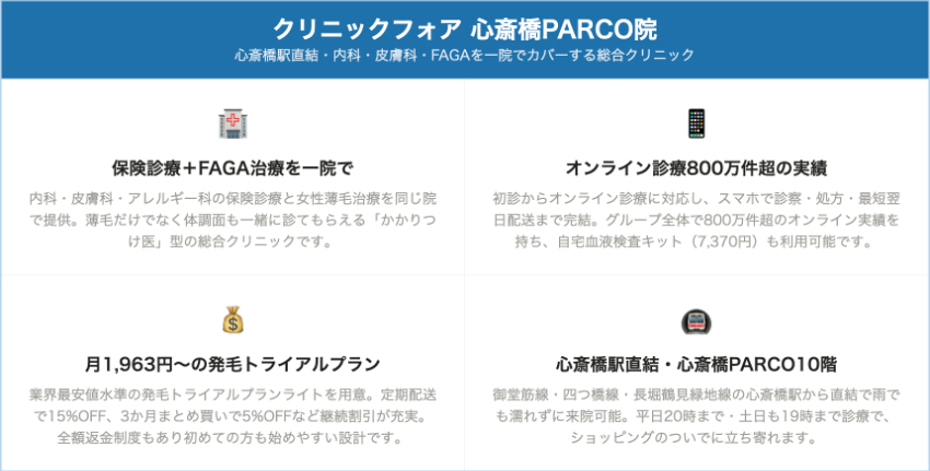 費用を最優先するならクリニックフォア心斎橋PARCO院(月1,963円〜)、女性専門の実績重視ならクレアージュ大阪・AGAスキンクリニックレディース、週末夜間の通いやすさならAGAスキンクリニックレディース大阪梅田院(22時年中無休)、再生医療まで対応する総合力なら大阪AGA加藤クリニック・大阪梅田皮フ科スキンクリニックが選択肢になります。