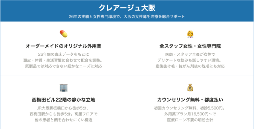 クレアージュ大阪|26年の実績と女性専門環境で、大阪の女性薄毛治療を総合的にサポートするクリニック