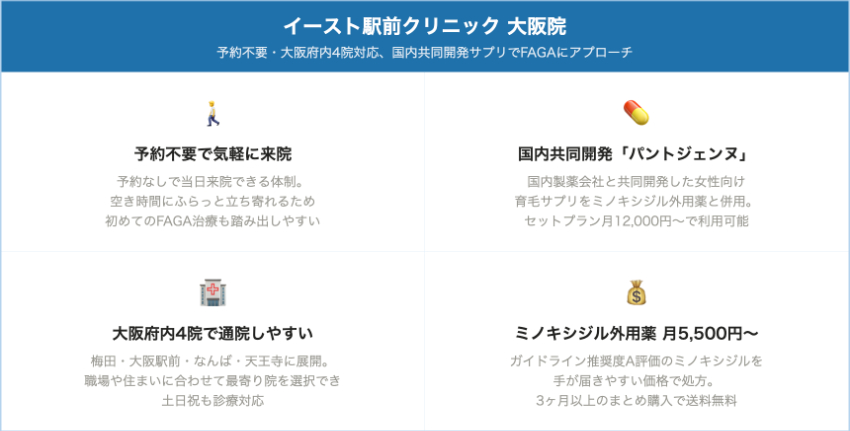 費用重視の場合はイースト駅前クリニック・クリニックフォア心斎橋PARCO院が比較的始めやすい価格帯です。専門性・実績重視の場合はクレアージュ大阪やAGAスキンクリニックレディースが候補になります。