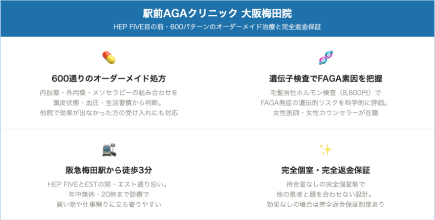 エリアで絞る場合、梅田エリアはクレアージュ大阪・AGAスキンクリニックレディース大阪梅田院・ウィルAGAクリニック大阪梅田院・駅前AGAクリニック大阪梅田院・大阪AGA加藤クリニック梅田院・イースト駅前クリニック梅田院など選択肢が最も豊富です。