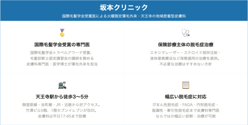 保険診療での脱毛症治療を望む方には坂本クリニックが唯一の対応院です。