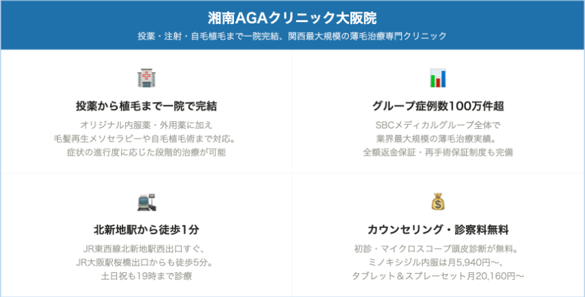 心斎橋・難波方面はクリニックフォア心斎橋PARCO院・湘南AGAクリニック大阪院が中心で、天王寺・阿倍野方面はAGAスキンクリニックレディース大阪天王寺院・坂本クリニックが対応しています。