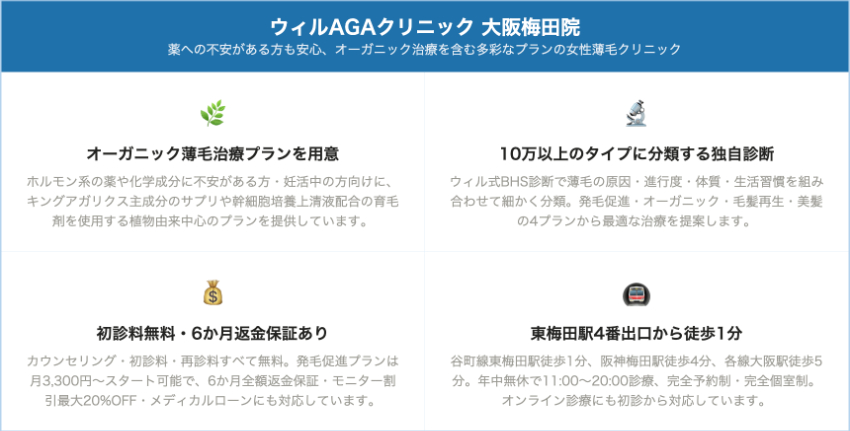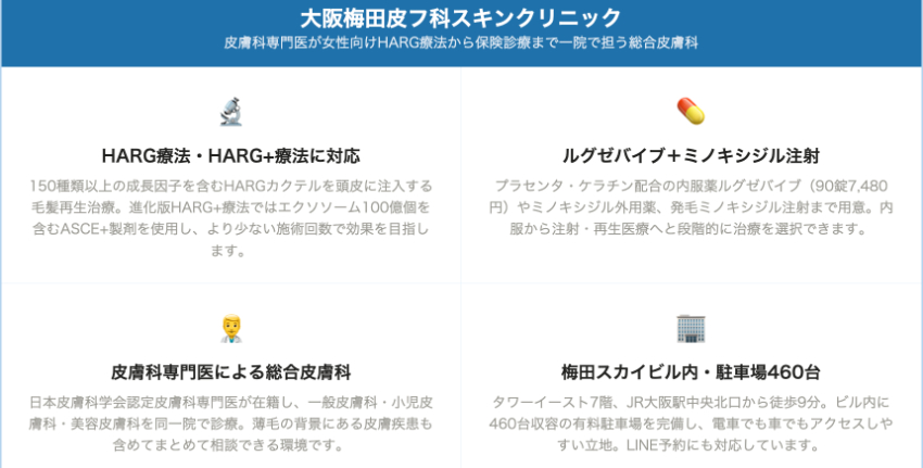 大阪梅田皮フ科スキンクリニック・ウィルAGAクリニック大阪梅田院・駅前AGAクリニック大阪梅田院などで対応しています。