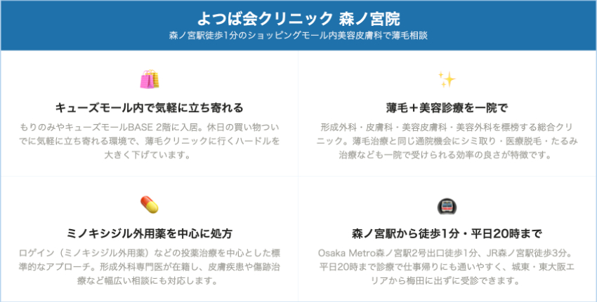 城東・東大阪方面は、よつば会クリニック森ノ宮院が最寄りの選択肢となります。