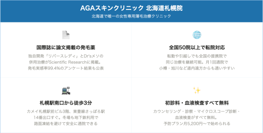 AGAスキンクリニック 北海道札幌院は、2014年の開院以来、北海道内で唯一の女性専用薄毛治療クリニックとしての地位を確立してきた専門院です。