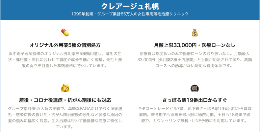 クレアージュ札幌(Dクリニック札幌クレアージュ外来)|1999年創業・グループ累計65万人の女性専用薄毛治療クリニック