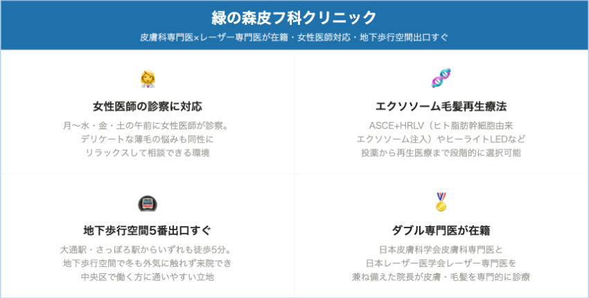 札幌市内には、JR札幌駅や地下鉄大通駅・すすきの駅周辺を中心に、女性の薄毛治療に対応したクリニックが複数あります。