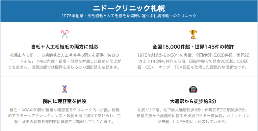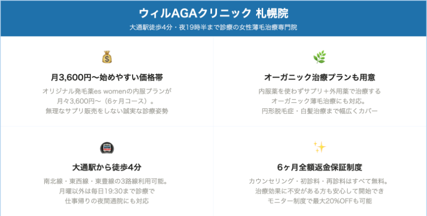 この記事では、札幌の女性薄毛治療クリニックを費用・立地・実績などの観点から詳しく比較していますので、クリニック選びの参考にしてみてください。
